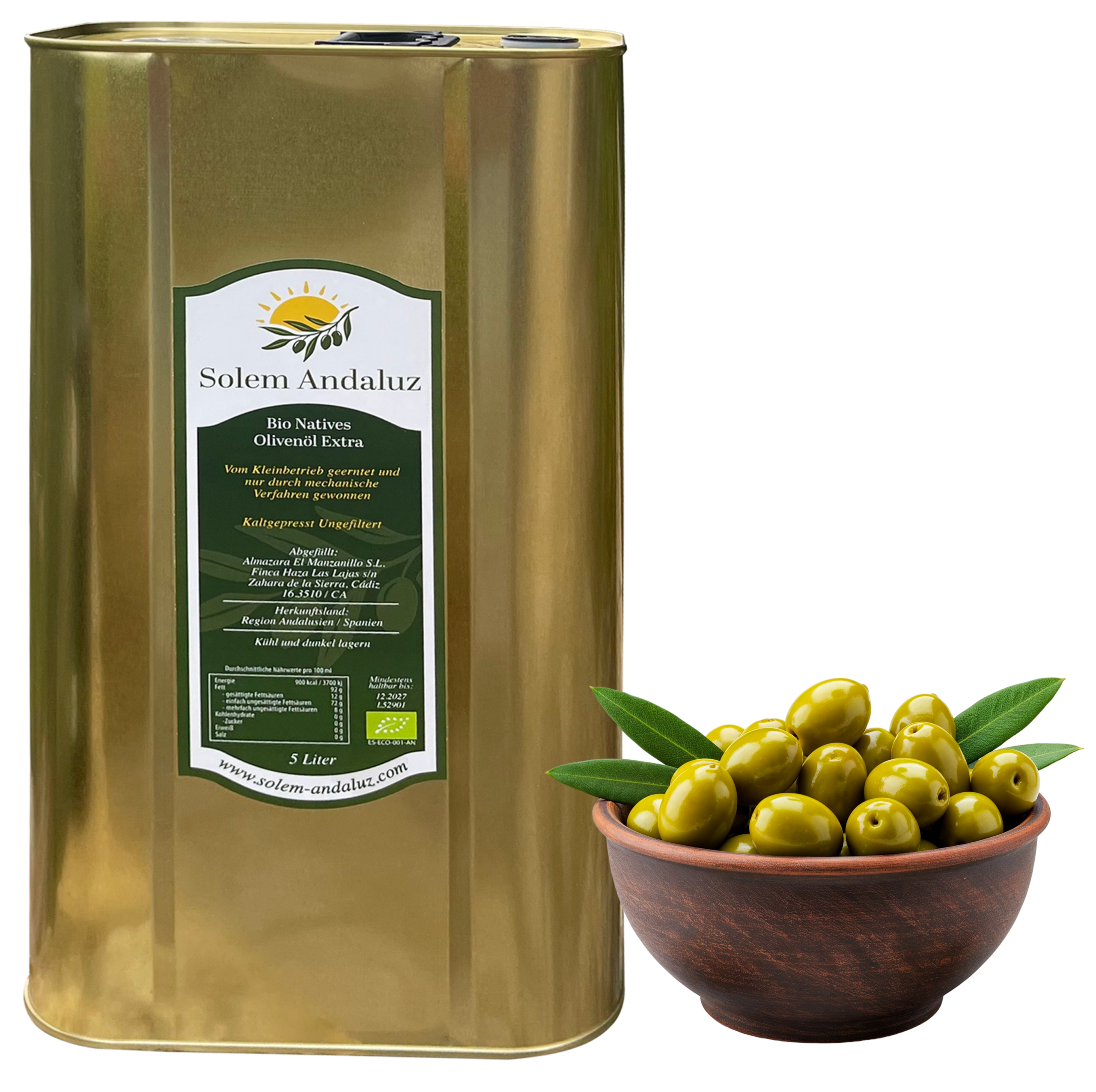 Unsere Oliven werden ausschließlich kalt gepresst, um alle wertvollen Inhaltsstoffe zu erhalten. Das Ergebnis ist ein hochwertiges natives Olivenöl extra, das sich durch seinen fruchtig-frischen Geschmack, eine ausgewogene Schärfe und feine Bitternoten auszeichnet. Perfekt für die mediterrane Küche, zum Verfeinern feiner Speisen oder einfach pur mit frischem Brot – Solem Andaluz ist ein Genuss für Kenner und Liebhaber echter Qualität. Derzeit erhältlich in 0,5 Liter Glasflaschen und in 5 Liter Kanistern solange der Vorrat reicht.